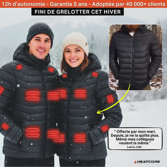 Après un an d'usage, notre première veste Heatcore fonctionne toujours aussi bien. Nous en rachetons une seconde : chaleur immédiate, confort au quotidien, chacun la sienne désormais.