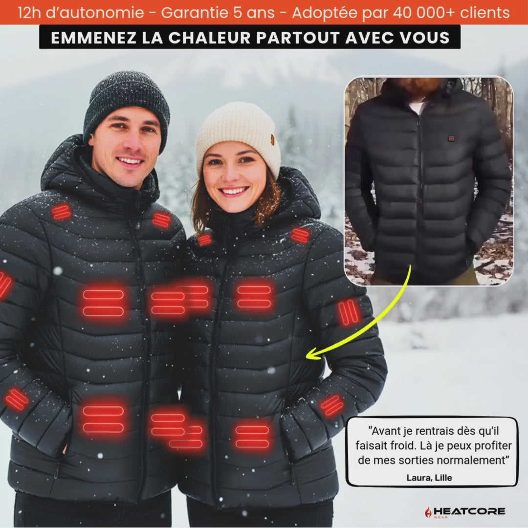 Tout ce qu’il faut savoir sur la veste chauffante Heatcore : chaleur, autonomie, sécurité, lavage, tailles… Si vous ne trouvez pas la réponse ici, écrivez-nous — on répond vite.